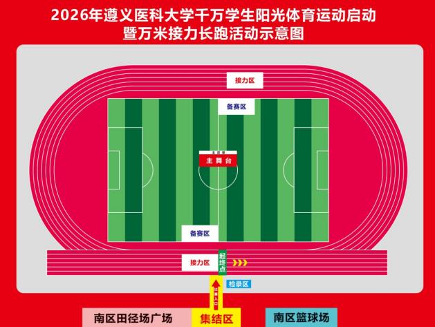 为深入落实2026年全国基础教育重点工作部署会“健康第一”工作部署会和全省教育工作大会精神,全面实施学生体质强健计划,以全面施行《学生体质健康标准》,大力推进体育课内外活动以及竞赛活动为重点,培养学生锻炼习惯,提升学生在身体、心理和社会适应能力,进一步丰富学生校园文化生活,推动校园体育文化的建设,提高我校精神文明建设,定于2026年4月15号在遵义医科大学校园内举办万米接力长跑活动。