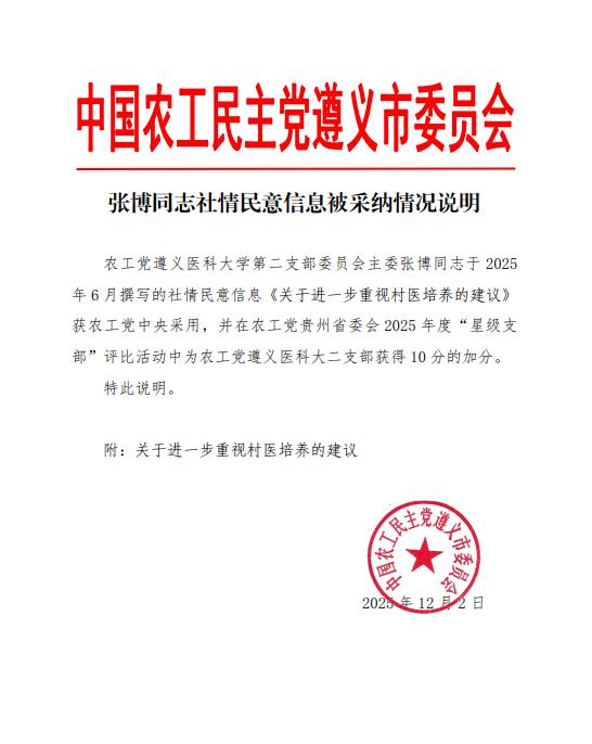 近日,我校农工党二支部主委张博撰写的《关于重视村医培养的建议》社情民意信息被农工党中央委员会采纳,并在农工党贵州省委会2025年度“星级支部”评比活动中为农工党遵义医科大二支部获得10分的加分。这一成果既是我校统一战线成员参政议政能力的集中体现,也是学校服务国家基层医疗事业发展的又一重要实践。