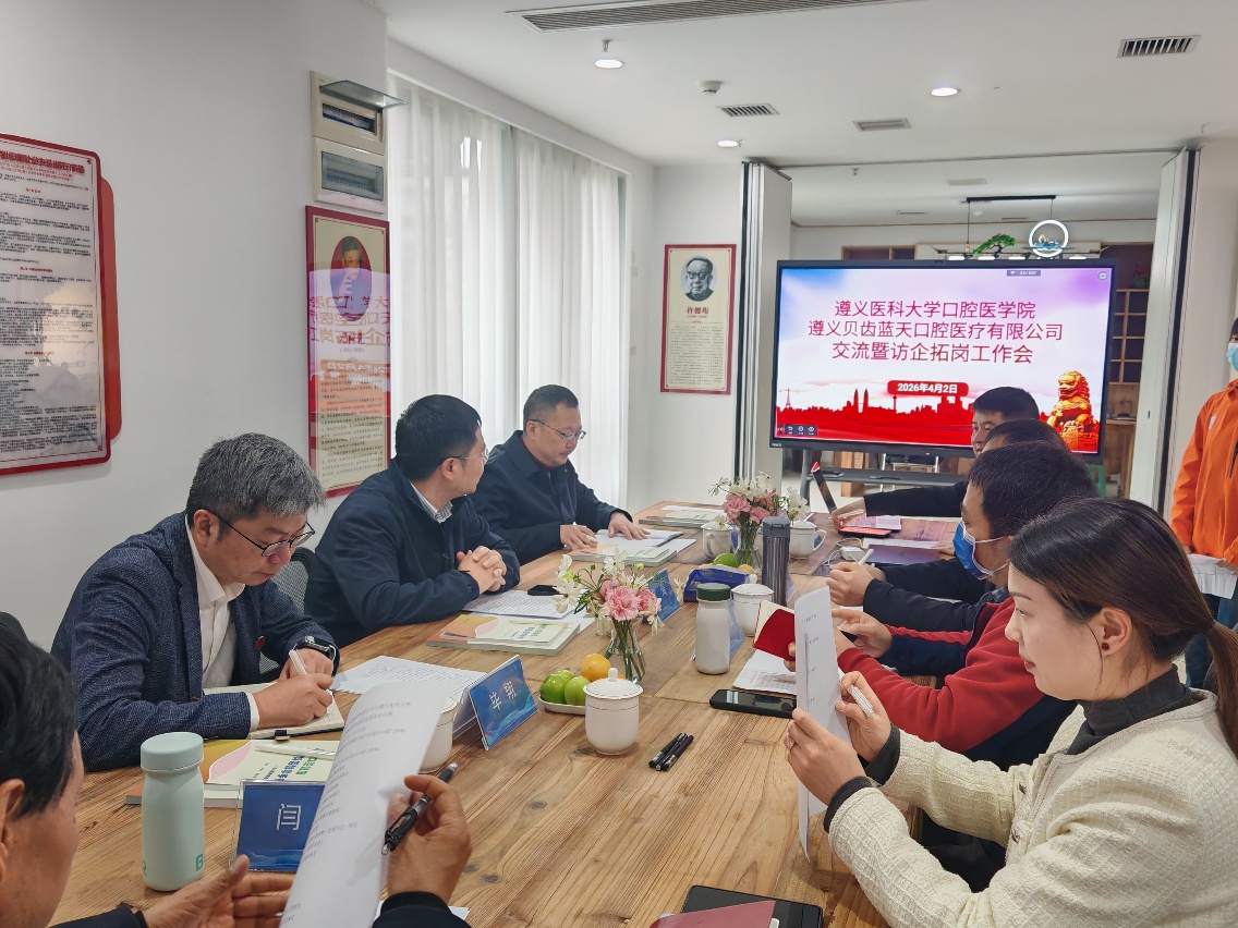 为进一步深化校企合作、供需对接,推动人才培养与市场需求精准衔接,4月2日,学校党委常委、副校长黄海带队到遵义贝齿蓝天口腔医疗有限公司开展访企拓岗专项工作并召开座谈会。口腔医学院学院相关负责人参加。