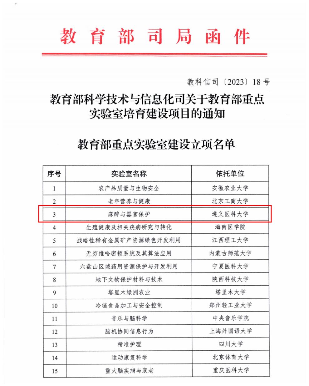 近日,教育部科学技术与信息化司公布了2023年教育部重点实验室培育建设项目立项名单,由我校组建的“麻醉与器官保护教育部重点实验室”获批立项建设。