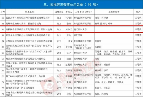 据悉,本届贵州省教育科学研究优秀成果评选奖励活动旨在落实创新是第一动力的要求,促进我省教育高质量发展,总结2018年至2022年我省教育科研战线所取得的研究成就。省教育厅先后开展会议评审、意识形态审核、推荐材料检视和厅党组审议等环节,历经半年时间,于近日公布获奖成果名单。