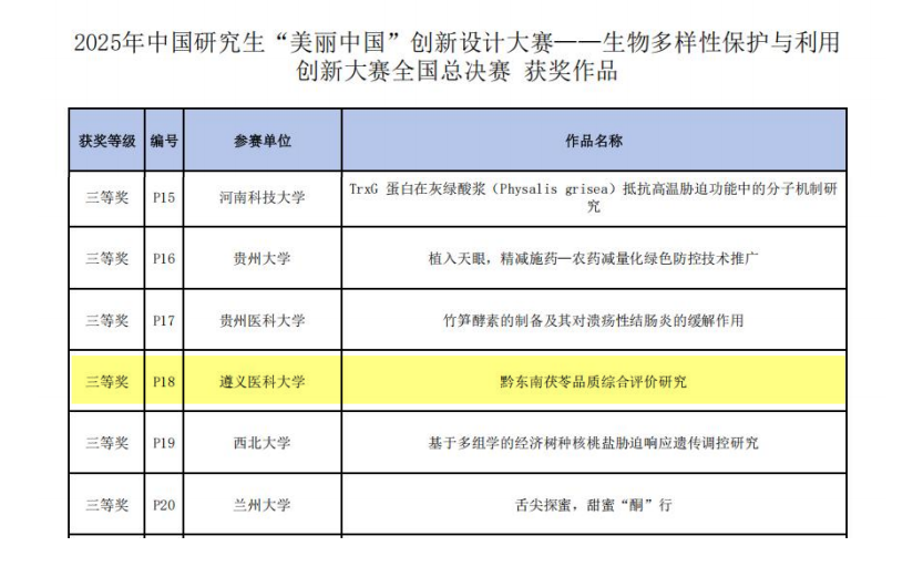 近日,我校药学院2024级硕士研究生柴林杉携作品《黔东南茯苓品质综合评价研究》(指导老师:付少彬),在2025年中国研究生“美丽中国”创新设计大赛(生物多样性保护与利用赛道)中斩获全国三等奖,充分彰显了我校研究生过硬的创新能力、扎实的科研素养与良好的团队协作精神。