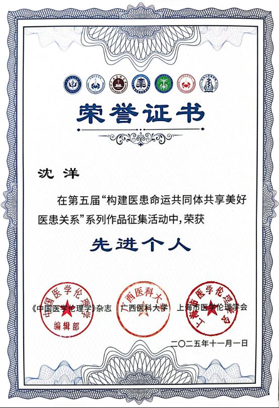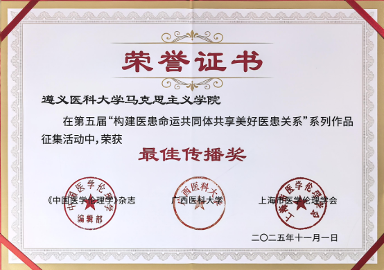 据悉,通过前期优秀作品征集,本次学术研讨会共收到来自全国一千余篇作品。同时,为表彰在构建医患命运共同体过程中发挥先锋模范作用的集体和个人,大会评审委员会还评选出“先进集体”(10家最佳传播奖,23家优秀组织奖,4家特别贡献奖)和“先进个人”。我校马克思主义学院荣获“先进集体(最佳传播奖)”,学院副院长沈洋获评“先进个人”,两篇学术论文获评优秀作品“三等奖”。