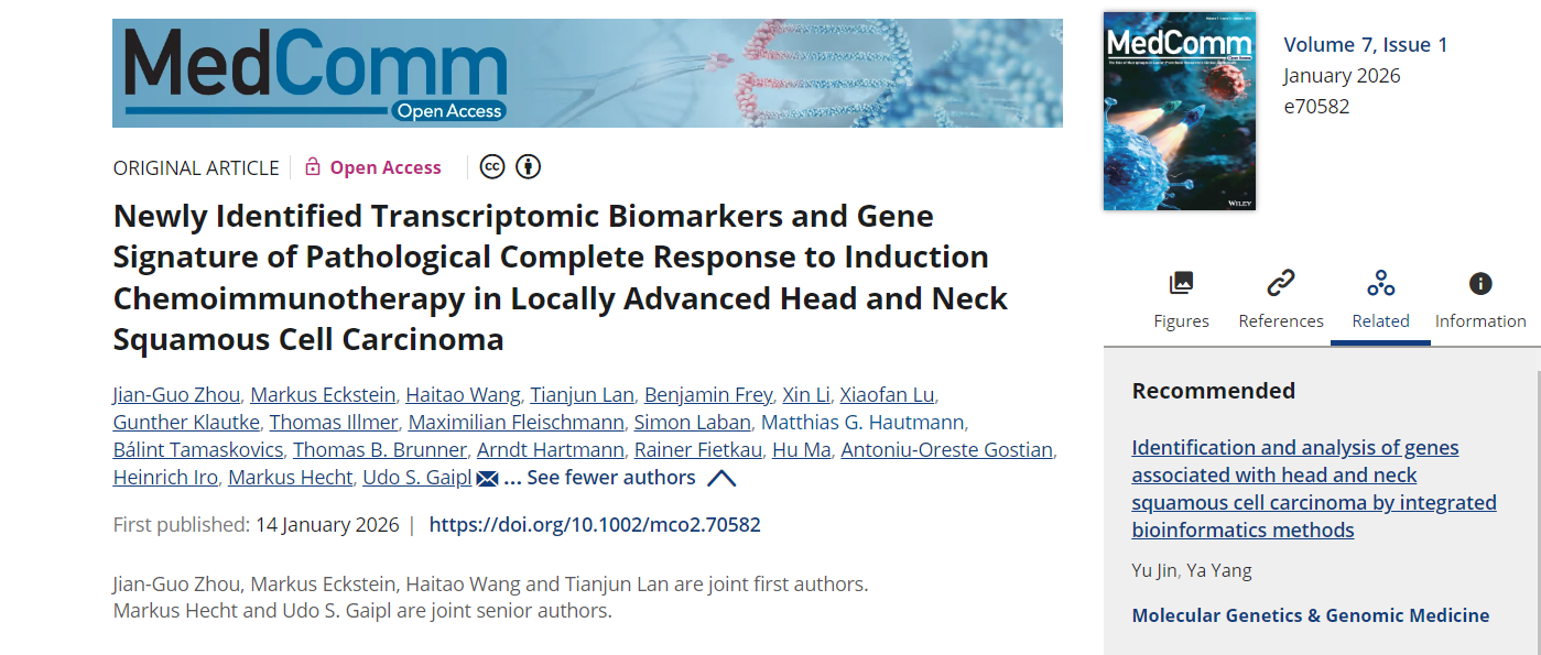 近日,我校第二附属医院马虎教授团队在期刊《MedComm》(IF= 10.70,中科院和JCR双一区,TOP期刊)上发表题为 “Newly Identified Transcriptomic Biomarkers and Gene Signature of Pathological Complete Response to Induction Chemoimmunotherapy in Locally Advanced Head and Neck Squamous Cell Carcinoma”的原创性研究论文。第二附属医院周建国主任医师为该论文第一作者,学校国际合作导师Udo Gaipl 教授和Markus Hecht教授为通讯作者。该研究得到国家自然科学基金、国家重大科技专项等支持。