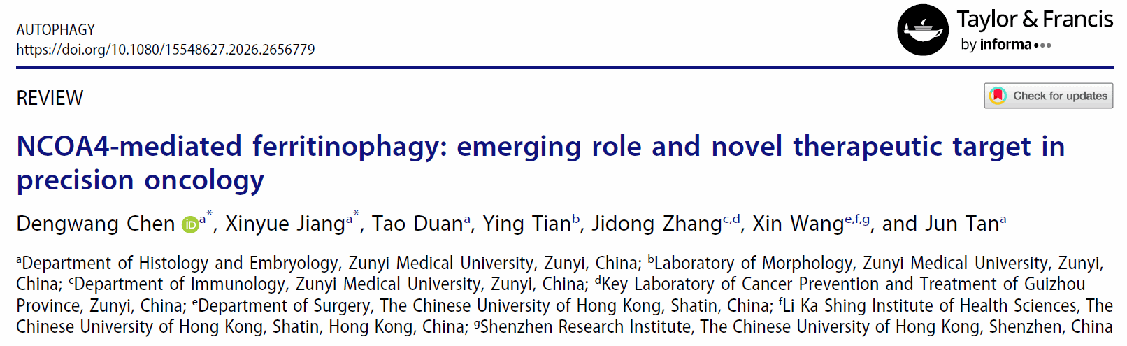 近日,我校张继东教授、檀军副教授联合香港中文大学王鑫研究员团队在自噬领域权威期刊《Autophagy》(影响因子14.3)发表了题为"NCOA4-mediated ferritinophagy: emerging role and novel therapeutic target in precision oncology"的综述论文。该论文系统阐述了NCOA4介导的铁蛋白自噬的分子机制,深入剖析了其多层次调控网络,并全面总结了靶向该通路在肿瘤治疗中的研究进展与未来挑战。我校基础医学院硕士研究生陈登旺和蒋馨悦为共同第一作者,我校张继东教授、檀军副教授和香港中文大学王鑫研究员为共同通讯作者,遵义医科大学为第一完成单位和第一通讯作者单位。